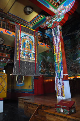 To the left, two large banners with Thangka Appliqué hung nearly 2/3 down to the wooden floor. More Thangka murals covered the interior walls, along with decorative elements in all colors and a bright yellow ceiling.
